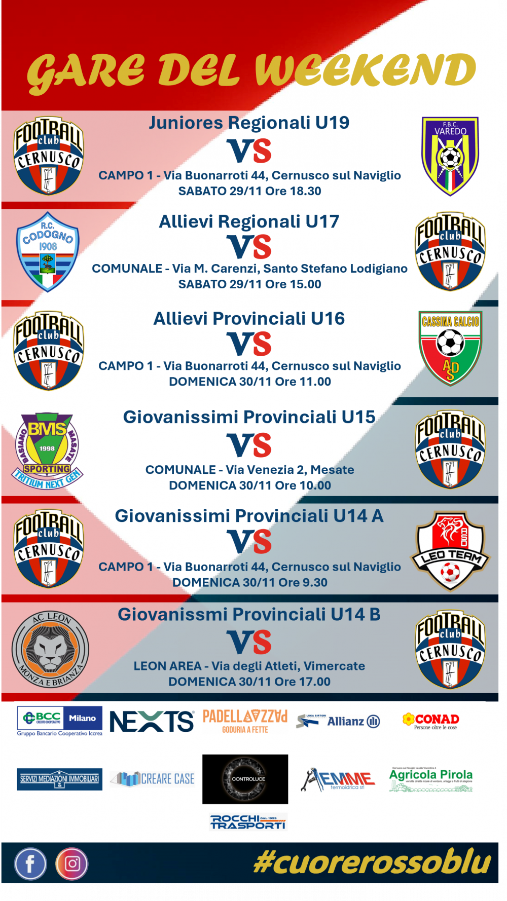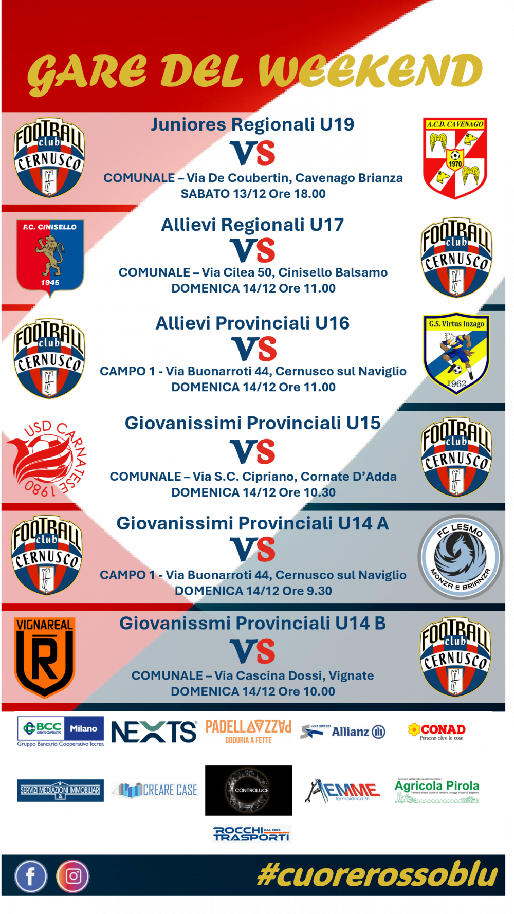 Il fine settimana si avvicina e il campo torna protagonista! Le squadre dell’FC Cernusco sono pronte a scendere in campo con grinta, entusiasmo e voglia di fare bene. Dai più piccoli ai grandi, ogni categoria avrà la sua occasione per brillare. Ecco il programma completo delle gare di sabato e domenica: vieni a tifare con noi!
